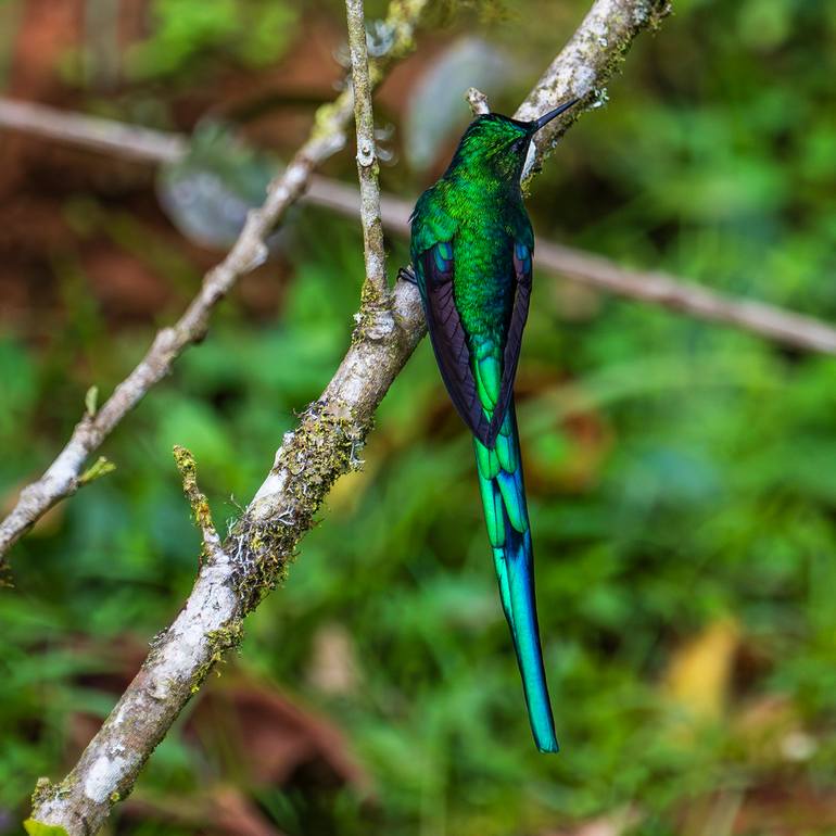 The vibrant plumage of the long-tailed sylph hummingbird is showcased in this captivating color photograph. The artist was particularly inspired by the iridescent green and aqua feathers of this tiny bird, native to Colombia.