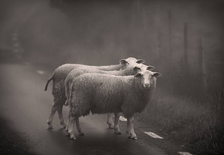 Three sheep that escaped from their fence and were out on a road, an early morning in the fog.