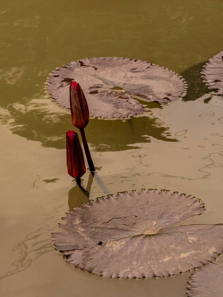 Two unopened lotus buds emerge from still, murky green water. Their deep burgundy color contrasts with the surrounding marsh tones, revealing a quiet, unexpected beauty within an unideal environment. The image invites calm contemplation of how harmony and grace can exist even in places that seem opa...