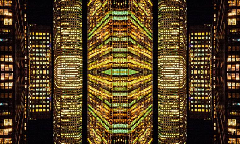 The Luminous Metropolis series was born from a long fascination with the urban environment at night, sky-scrapers, symmetry and the human presence within that landscape. A landscape of a million voices. The symmetry in this piece brings a sense of balance and harmony to the million voices represent...
