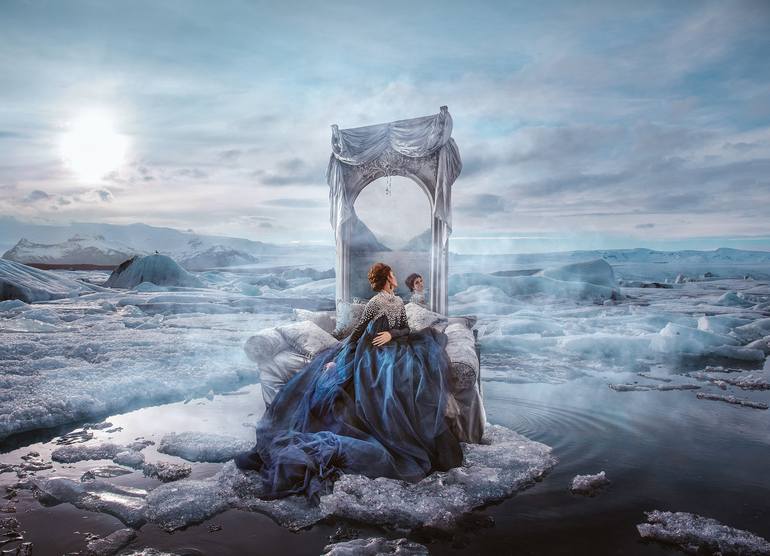 Melting Gaze, Bestseller sold out in Small and Large. XL Edition, 115 x 158cm (45 x 62") limited to edition of 10 + 2AP. A woman in an opulent dress gazes into a mirror upon an ice lagoon. "And the more she looked into the deep lagoon of her own being, the more pain of the cold she could feel. And...