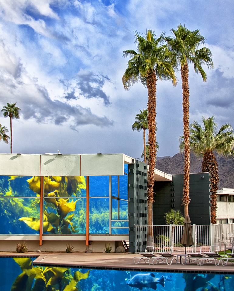 A colorful surreal image created by artist/photographer William Dey, where Palm Springs Midcentury Modernism meets the famed Atlanta Aquarium. "The Surreal Show" Infinite Exposure Art Exhibition at the University of CA Palm Desert, California. Curated by Tony and Karen Barone. Image is printed on m...