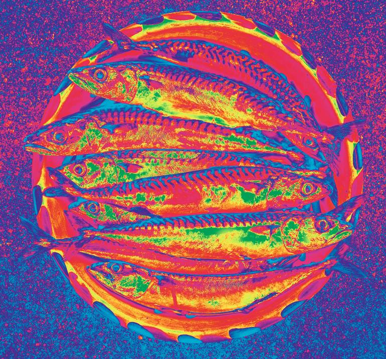 Fish that I'd caught after an afternoon on the sea in Cornwall, UK. Mackerel have be one of the smartest, most handsome fish you could wish to catch so it felt right to photograph them in black and white (see other print) but also they deserved some sort of technique to create something even more st...