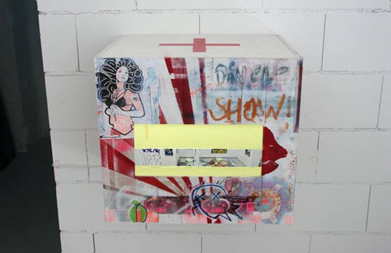 Holz, Kunststoff, Glas, Plexiglas, Printmedien, bemalt in l/Acryl