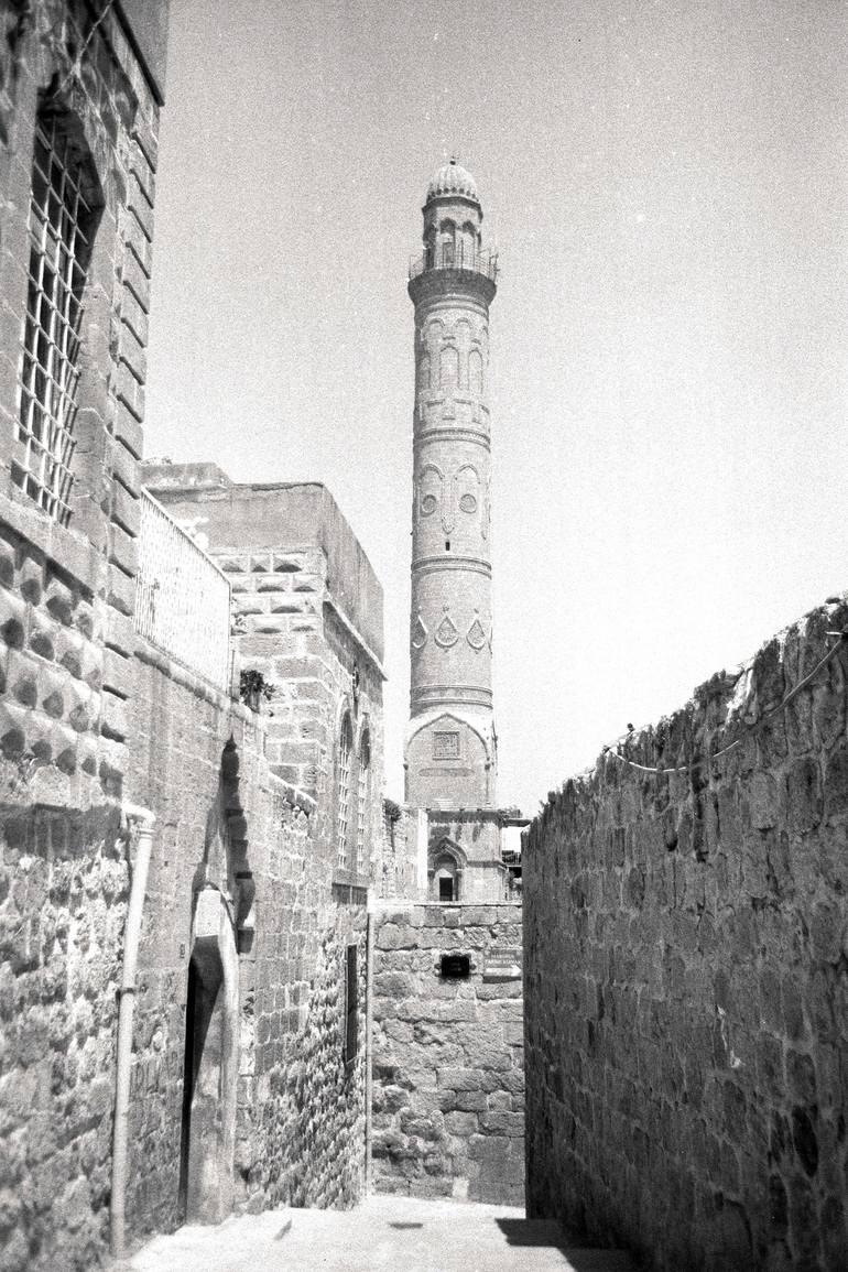 This photograph captures the striking minaret of a historic mosque in Mardin, Turkey, photographed from a dramatic low angle that emphasizes its soaring presence against the pale sky. The traditional stone crenellations in the foreground create a powerful diagonal line drawing the eye upward to the ...