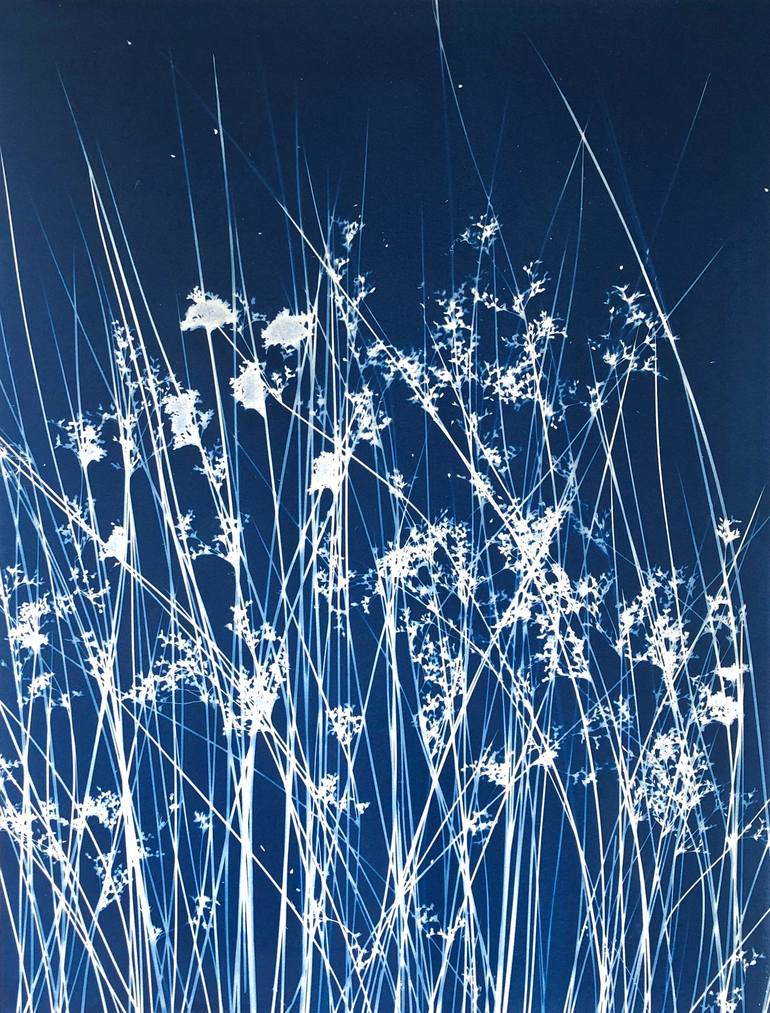 Clients include: Timothée Chalamet, Starbucks, Ritz Carlton, Mayo Clinic, Jumaira Resort (Dubai), Wyndham Worldmark Hotels, Kimpton Hotel Monaco, Evercore NY, Apollo Global Management, NY, Mazars Accounting NY, Limelight Mammoth Hotel & Residences, MD Anderson Hospital, Houston Methodist Hospital, Oakland International Airport. Christine So is a painter, photographer and printmaker living across the San Francisco Bay in the hills of Oakland, California. Her works are heavily inspired by the woods where she has lived and hiked for decades. She works in acrylic and in the antique photographic process of cyanotypes. She creates botanical and abstract prints without a camera lens, as well as hand-printed landscape photographs of the foggy woods where she lives. Whether it’s painting, printmaking, or photography, her work is always nature-inspired and nearly always monochromatic. She has worked in a dozen mediums, cycling back and forth from painting to printmaking to cyanotype, applying effects from one medium to the next. She bridges the mediums of photography, monoprinting and painting. Her favorite question when working in the antique photographic process of cyanotypes is “What would happen if…?” She has devised a range of atypical techniques using the cyanotype process. Arguably the most striking of her unique methods are her cyanotype paintings in her Delft Garden series. The painted silhouettes of plants each contain an intricate blue and white pattern within them when viewed up close.The lengthy process begins as a pencil drawing which is then painted in–not with ink or paint–but with the cyanotype light-sensitive mixture in a dark room. It’s a tricky process as it’s hard to see what one is painting in very dim light. Days later once the photography chemicals have dried in the painting, she lays plants on top of the painted silhouette in a pattern that will leave gaps similar to lace. She then carefully moves the entire bundle outside and exposes the pattern to sunlight to create the image-within-the-image. The blue and white pattern seen in each leaf resembles painted Delft pottery, thus the title of this series: Delft Garden. Another of the artist’s innovative techniques is her series of completely abstract cyanotypes printed without photo negatives or stencils.