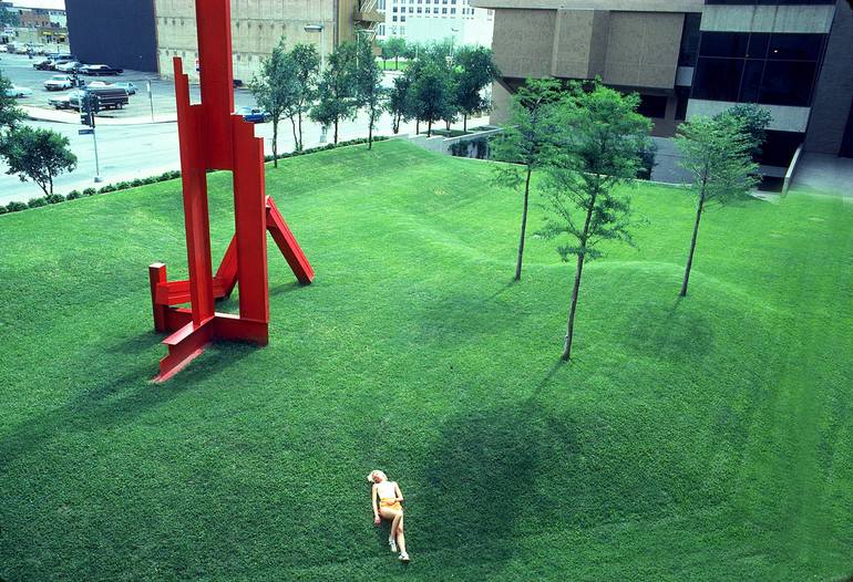 Back in my college days my friend Mary and I would wander around downtown looking for shots. When we came across this sculpture and green space she instantly laid down near it and I found a staircase and took the shot. Photo is infused into the Aluminum so that the images are razor sharp with vibran...