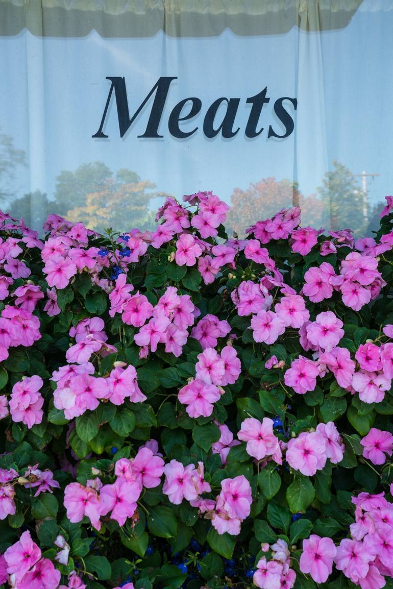 An incongruous -- I think humorous -- combination of word and object. This image of flowers below this food store front window was captured in the well-known Michigan tourist town of Leland. TECHNICAL NOTES: * Printed with pigment inks through an Epson SC600 printer on premium matte paper. * Actua...