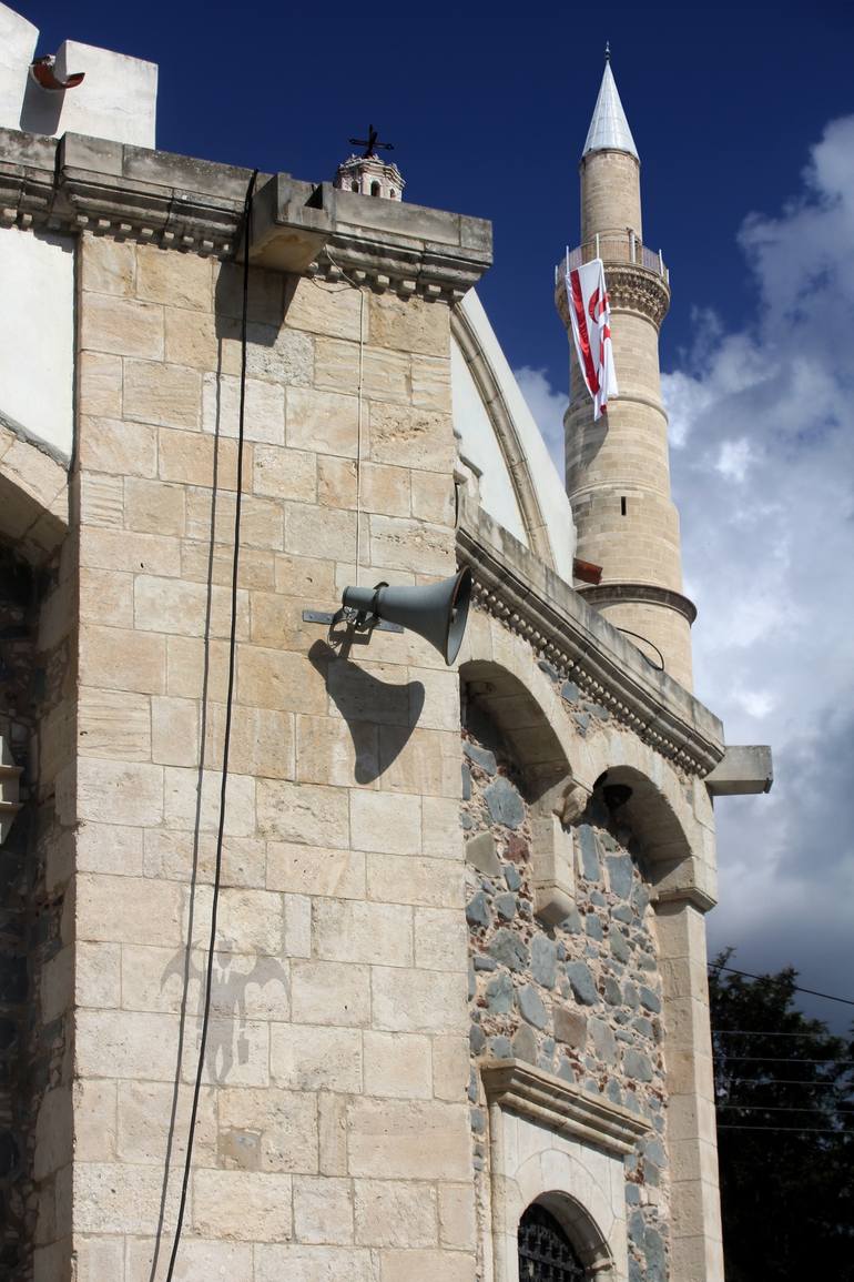 Orthodox church in Cyprus equiped with megaphone and sprayed with graffiti of the devil coming to do business.
