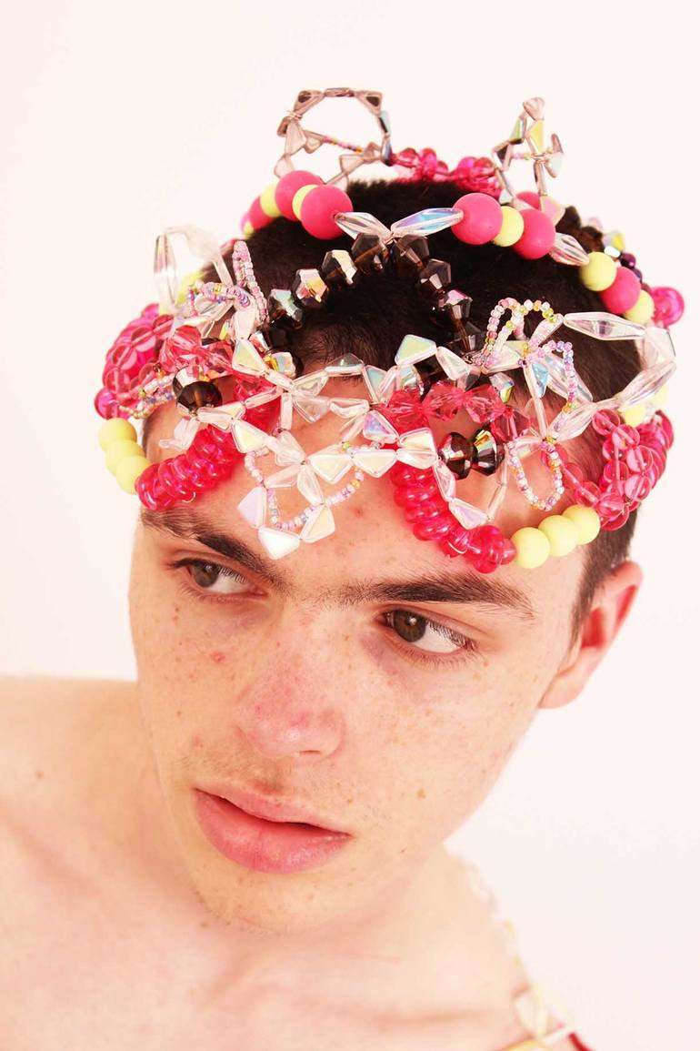 This photo is a selection from a photographic series inspired by Walter Pearce. Anglesey's hand-knitted garment is worn by Walter, shapeshifting him symbolically into a merman. The picture showcases his seductive gaze and poses in a neutral space. Sparkling crystals and beads are woven through the l...