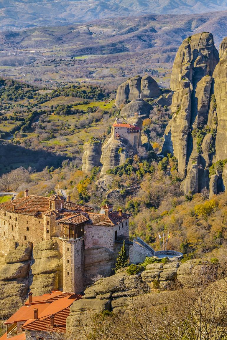 Aerial view of monasteries at top of rocky landscape, meteora site, tesalia, greece.