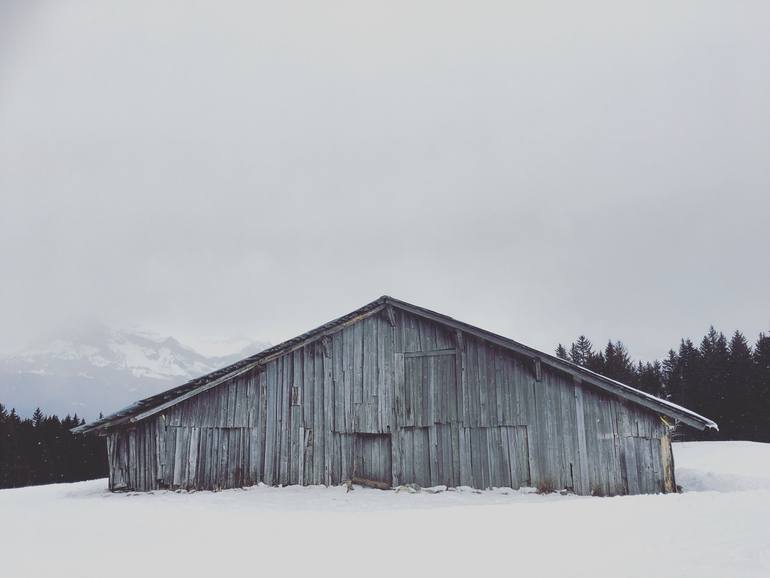 This limited edition fine art photograph captures the raw, minimalist beauty of a solitary barn set against a snowy landscape. The weathered texture of the wooden barn contrasts with the pristine white snow, while the veiled mountains and dark trees in the background add subtle depth to the scene. W...