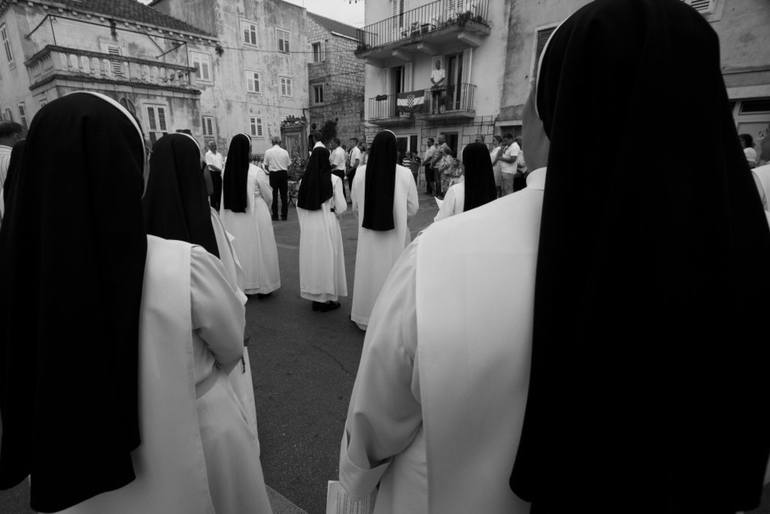 The street scene is full of symbols: framed mostly in black as domestic life for so many people here in Croatia, with dominant nuns turned off of us. with no identity, they are representants of mighty Catholic Church which is focused on two objects: statue of some Saint and Croatian flag which bring...