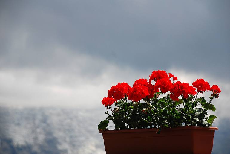One of three photographs of Montblanc illustrating the esthetic beauty of this famous site.The red flowers contrast against the white background