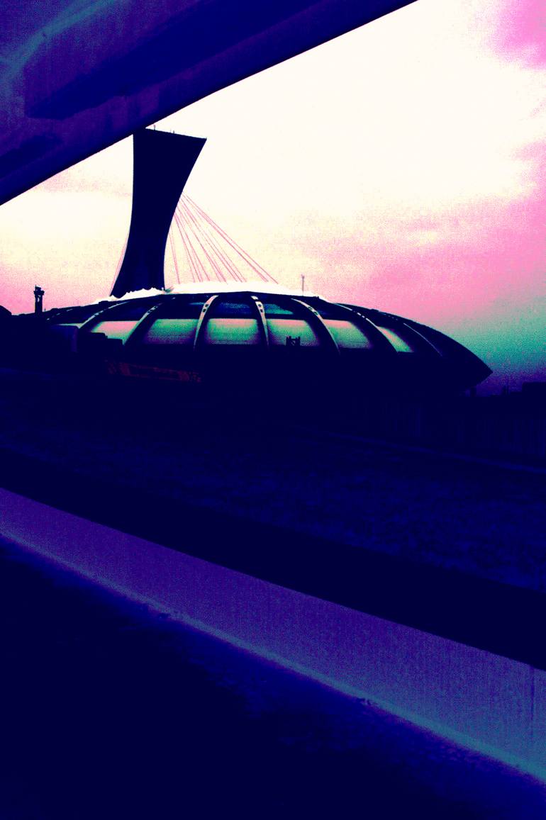 This work is a photo of the olympic stadium in Montréal. I wanted to capture the surreal feeling given by the architecture. The building itself is odd and looks like a spaceship, so I manipulated the photo to emphasize this.