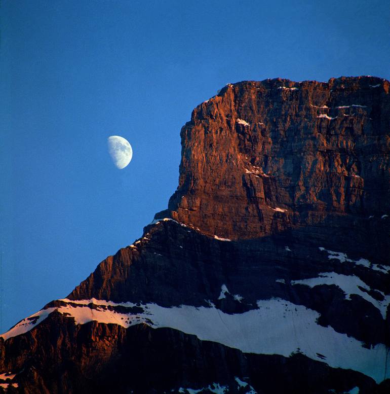 Available in other sizes. A half-moon rises thru a cobalt sky over the Canadian Rockies in 1966 I print my own work to preserve the utmost quality, and do so with archival inks on archival paper.