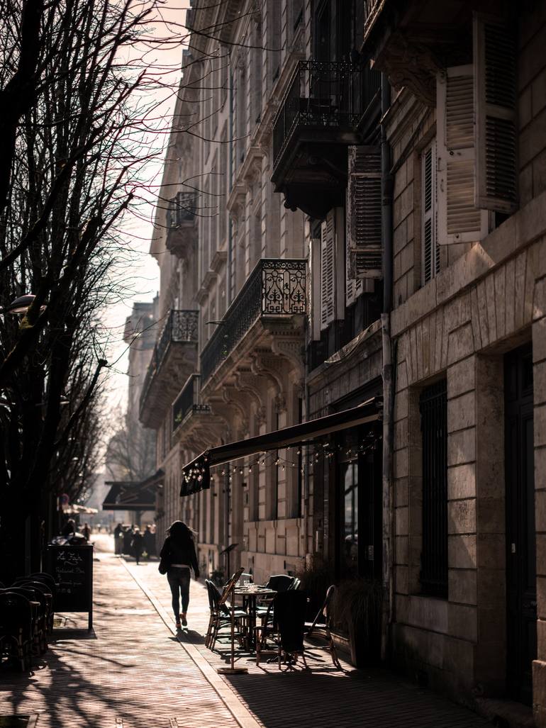 Capture the serene beauty of an early morning in Bordeaux, France. A woman, dressed casually, walks away from the camera along a quiet sidewalk, bathed in the soft glow of the rising sun. The vibrant hues of the morning sky contrast beautifully with the historic architecture of the city, visible on ...