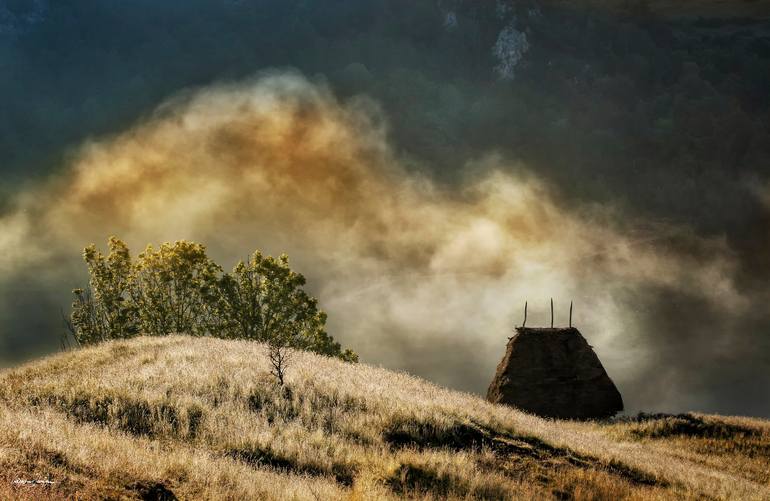 Capture the serene beauty of a misty sunrise with "Morning in the Apuseni Mountains," a captivating color photograph. This stunning piece depicts a humble shed nestled within a foggy, mountainous landscape, evoking a sense of tranquility and rustic charm. The scene is bathed in the soft light of daw...