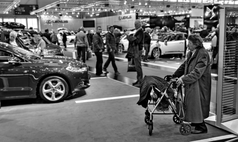 Fineart street photo in black and white Elderly woman with rollator at an exhibition of modern motorcars in Vienna, Austria. The image begins as a real photograph, expertly transformed through digital techniques. It's then printed as a C-type print using lightjet laser exposure on Photo Paper. The ...