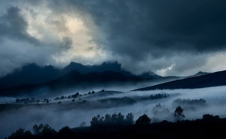 I discovered this landscape on an incredible photo trip around Ecuador in South America. It was near the Quilotoa Volcano very late one night. The mist and the clouds mingling with the dramatic landscape was magical. Archival C-Type Photograph. Edition 1 / 20. Print only. Printed with white bor...