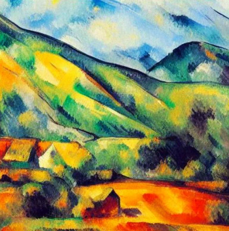 A.I. created print an interpretation from my description representing a selection of small building gathered together adjacent to fields of corn surro9und by bushy trees and rolling grassy hills.