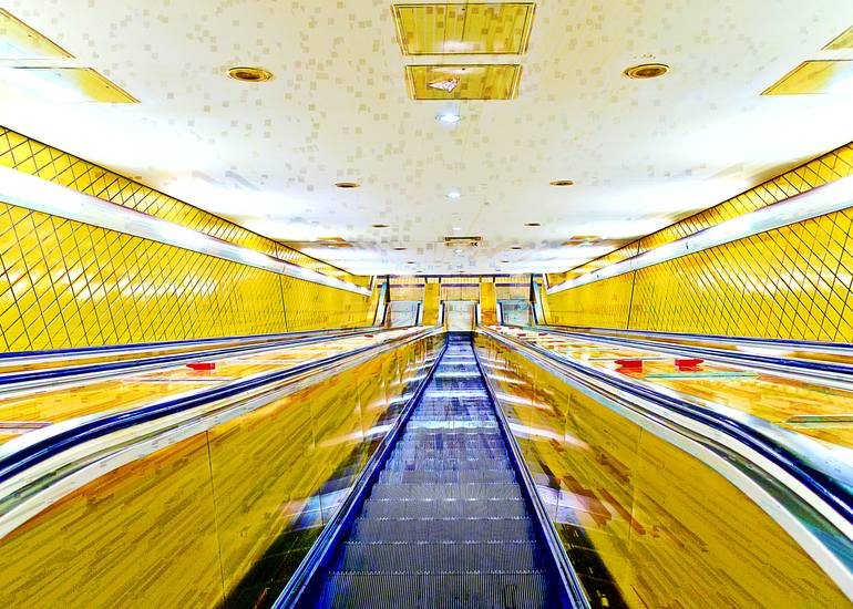 This modern fine art photograph captures a moving stairway in the Gänsemarkt underground station of Hamburg, Germany. Part of a limited edition of only 5, this photorealistic piece will add a touch of urban sophistication to any space. The artwork begins as a real photograph, transformed through d...