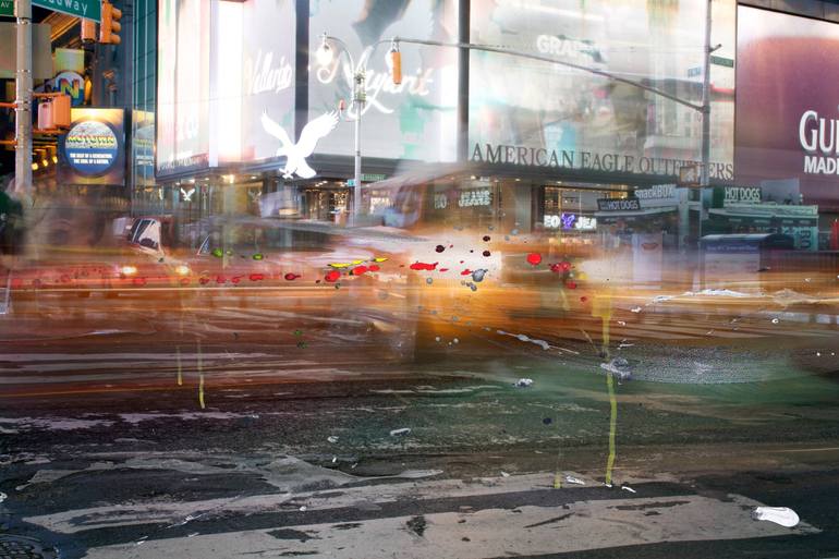 Photograph of Times Square with paint elements. Depicts street motion.