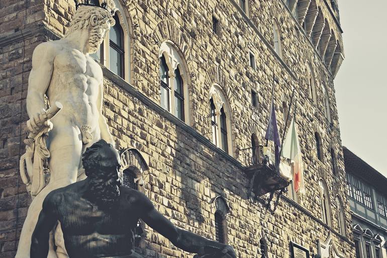 In this composition, Bartolomeo Ammannati's sculpture of Neptune and Palazzo Vecchio emerge in a winter setting. The delicate light of the early afternoon caresses the statue and the facade of the palace, creating an atmosphere of calm and elegance. The cold and imposing marble of Neptune contrasts ...