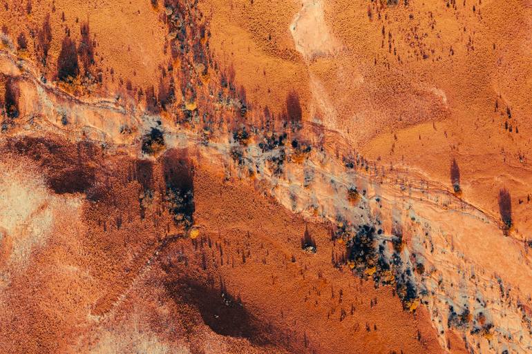 'Never-Never Land' is an abstract dreamscape of the Australian outback. This artwork features a rich, rusty, earthy palette with painterly textures that resonate to expose the beauty and romance of this rugged land from an aerial perspective.