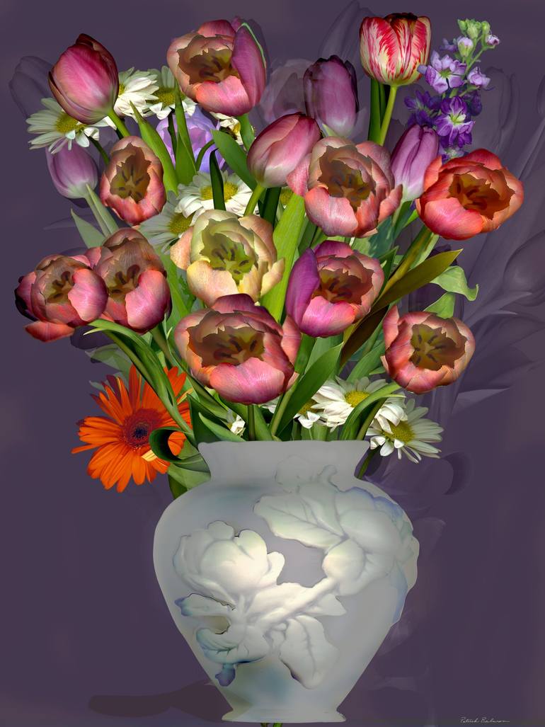 "New Tulips 2" is an arrangement of red tulips and other garden flowers placed in an antique vase. This print is part of a large series exploring elegant use of color, pattern and textures of flowers which are set against a bold block of color. This arrangement contains red tulips, white daisies and...