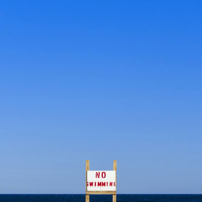 I find this image mysterious. The empty blue sky and the sliver of sea evokes a sense of calm. That calm is broken by a stark and roughly made "No Swimming" sign. Why is there no swimming, what is hidden below the frame? Image size is 18.5"x18.5" on 20"x20"printed on Hahnemuhle FineArt Baryta Satin...