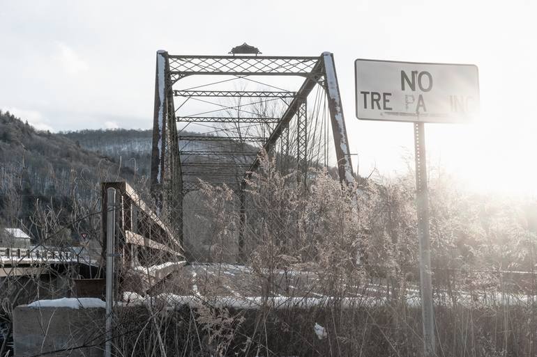 Golden hour suffuses a preserved bridge, New York State. Snow dapples steel cross-structures as if they were tree limbs. All bear witness to rolling shadows and frozen flares of light. "Frozen Warnings" recalls the majestic Nico song, from her album, _The Marble Index_ (1968). Edition of 5 + 1 A/P ...