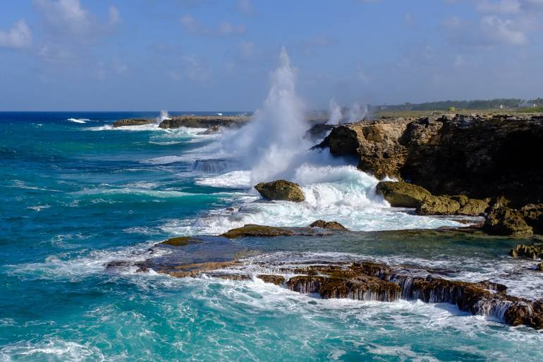 Where the Caribbean sea meets the Atlantic ocean, powerful waves break against steep rocky cliffs at North Point, Barbados. Misty plumes of spray rise from turquoise water to the blue sky above.