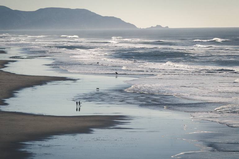 This photo of Ocean Beach was taken from the Cliff House Restaurant in San Francisco. Something that I often do when out with my camera is find a scene that interests me and then wait for the elements to line up in a way that pleases me. I loved the way the couple, dog and surfers came into view. ...