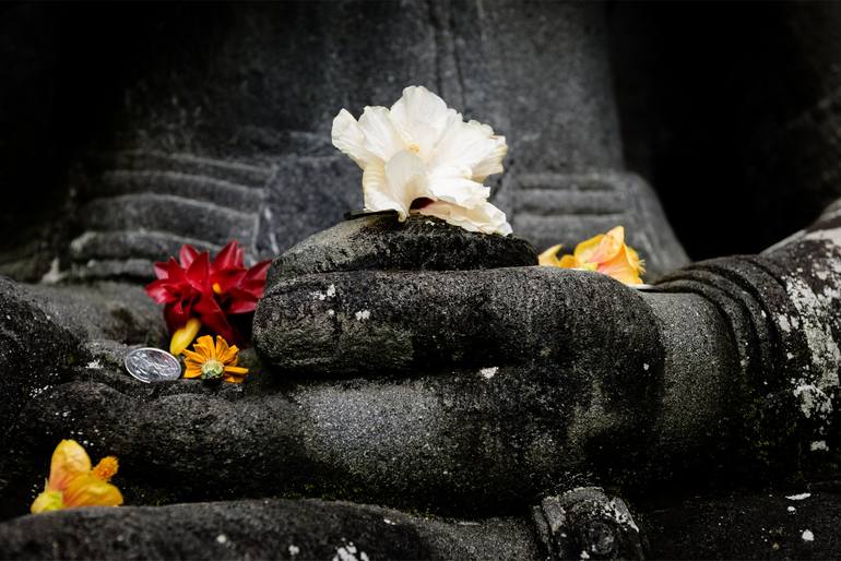 This image is from the very tranquil Crystal Castle & Shambhala Gardens near Byron Bay in New South Wales, Australia. People visiting the gardens place offerings in the form of flowers and coins on the many various statues placed around the site. This is a statue of Lakshmi, the Hindu goddess of wea...