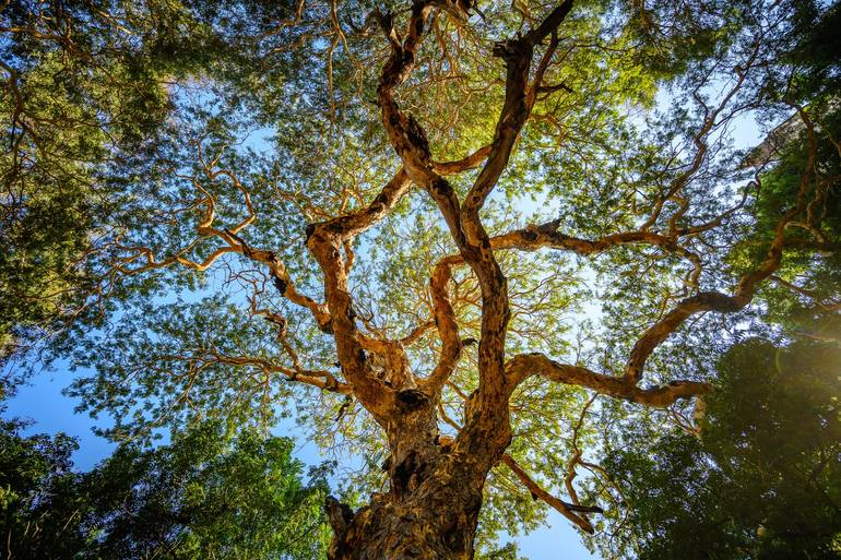 A two hundred-year-old Htanaung Tree or Acacia leucophloea at the Old Bagan Plains in Myanmar's UNESCO Heritage city of Bagan. Its marbled trunk seems to twist and turn in the air as it eventually forms the characteristic wide umbrella-like crown found in mature trees. They form such an imposing pr...