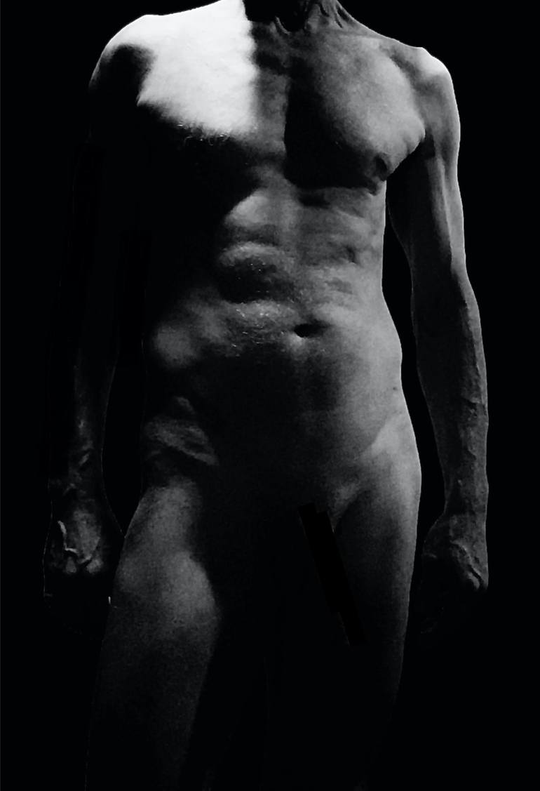 A monochrome depiction of a muscular mature male form is highlighted dramatically against a dark background, emphasizing the play of light and shadow on the figure's contours. The use of chiaroscuro enhances the visual impact, focusing on the anatomy and structure.