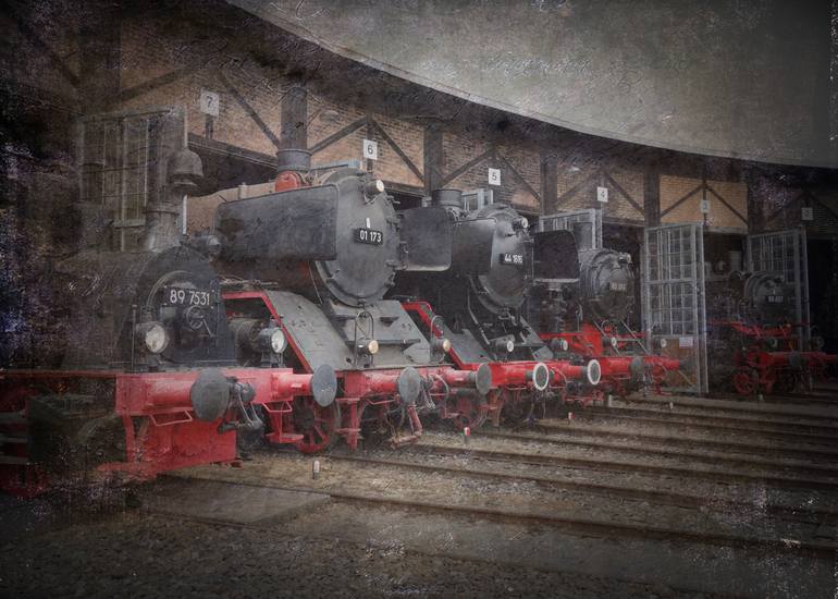 Manipulated Digital Photography Old steam trains in the depot z10 by Ksavera The photo was taken by me, first digitally optimized, then layered with textures and intensively worked out in Photoshop. Fine Art Photography printed on canvas, paper etc.