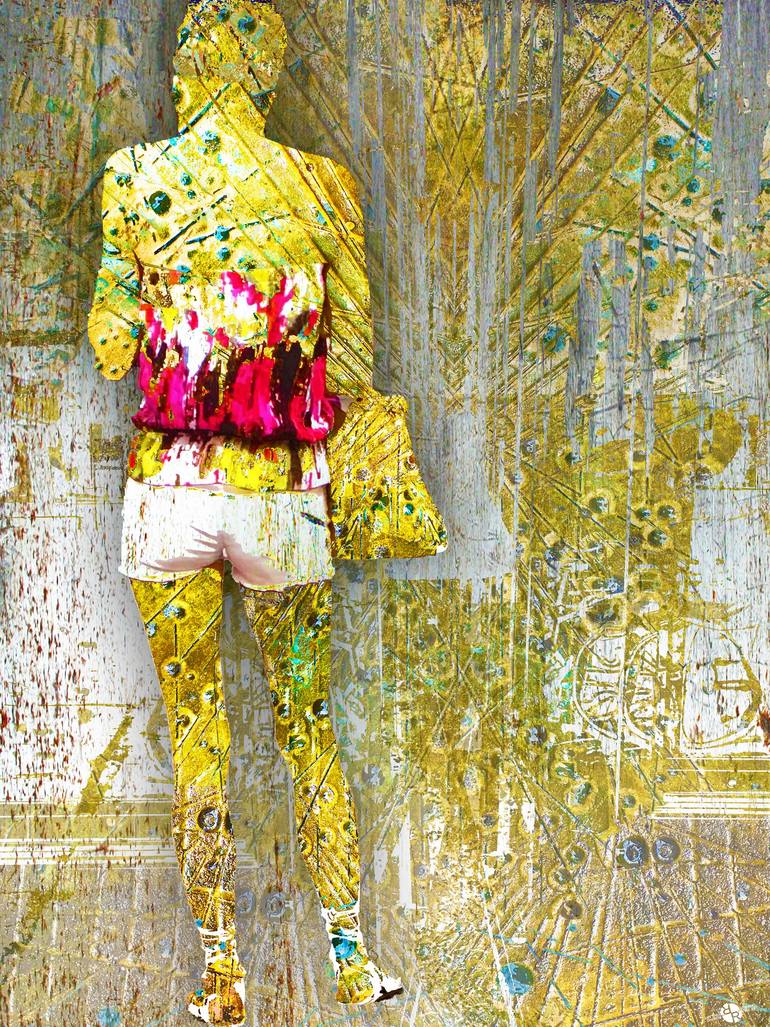 Woman on the street in New York City captured in sheet metal on metallic paper with acrylic on stretched canvas.