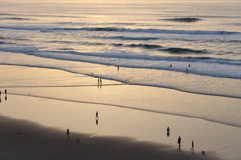 People enjoying one last walk on the beach, before going home. The light is soft and the sky is multiple nuances of pink. The sun just set after a summer day in Biarritz