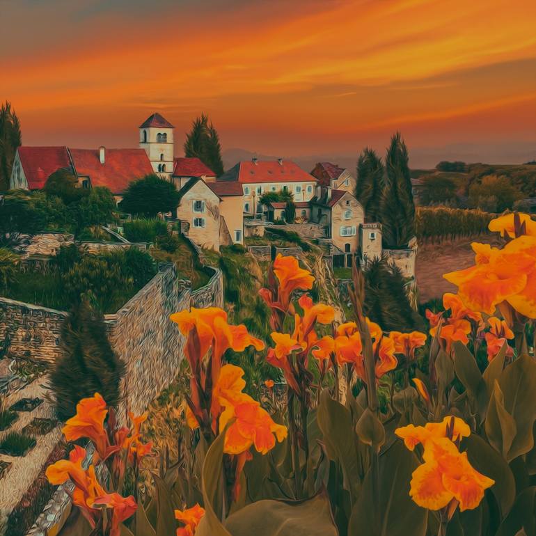 Orange irises in the background of the old city. 3D illustration.