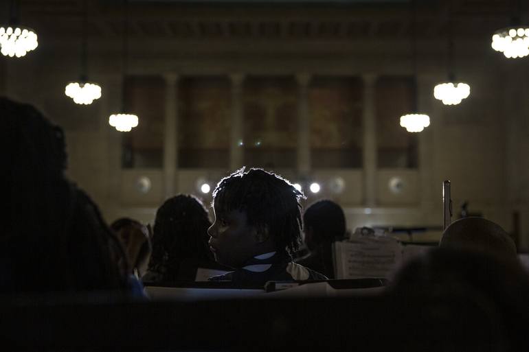 A member of the OrchKids youth listens during a concert in Baltimore, Maryland. Marin Alsop, music director of the Baltimore Symphony Orchestra, gor the OrchKids after-school program by pledging $100,000 of her own money- part of a MacArthur "genius" gant she won in 2005- as a match to encourage oth...