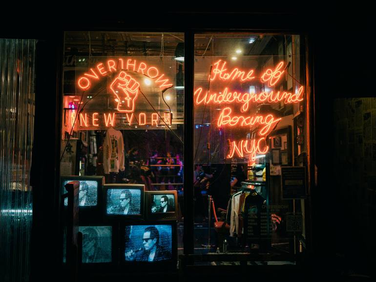 Overthrow Boxing Club neon signs, Manhattan, New York - digital photographic print by travel photographer Jon Bilous