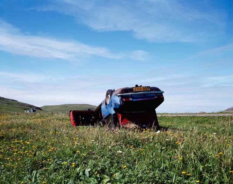 ALSO OFFERED IN A SMALLER PRINT SIZE LIMITED EDITION. 76CM X 61CM / 30” X 24” PLEASE ASK FOR CURRENTLY AVAILABLE EDITION NUMBER AND PRINT PRICE. ______________________________________________________________________________________________ An overturned car in a field on Barra, an island in the Ou...
