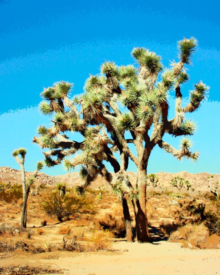 A cluster of Joshua trees against a painted desert sky in various shades of blue, creating somewhat of a monochromatic rainbow effect. Photographed on location in Joshua Tree Nation Park California, by William Dey. Image is printed on white Picture Rag museum-quality paper and measures 16"W X 20"H w...