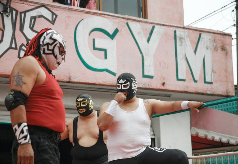 Image part of the project "the fight outside the ring" About mexican wrestlers and the fight outside the profesional wrestling enviroment. In the image we can see some wrestlers getting ready to fight in Neza, a conflited neighbouhood in Mexico city. Ask for different sizes.