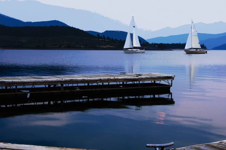 Sailboats on a peaceful Rocky Mountain lake. Blended landscape photo mixing painted techniques with photography for a surreal look.
