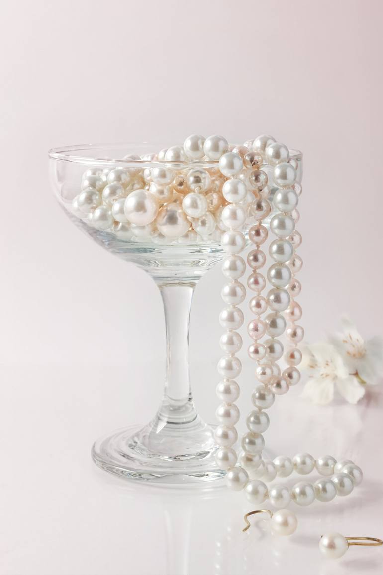 Pearls in a champagne glass. Still life image that combines the ultimate luxury in a cheerful and unexpected way.