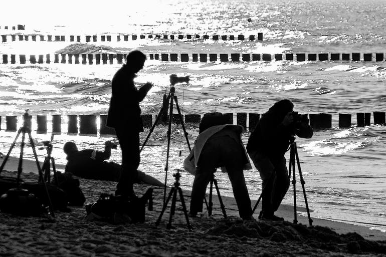 Fineart street photo in black and white Members of a photographers workshop at the beach of the Baltic sea on ocassion of the event Horizonte Zingst, Germany. The image begins as a real photograph, expertly transformed through digital techniques. It's then printed as a C-type print using lightjet l...
