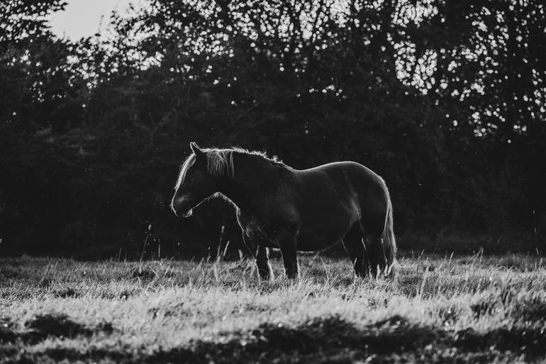 Pictorial Portrait 1.2 presents a monochromatic depiction of a lone horse standing in a pastoral landscape, captured in the low light of dusk or dawn. The photograph emphasizes the interplay between light and shadow, highlighting the contours of the horse’s form against a backdrop of softly blurred ...